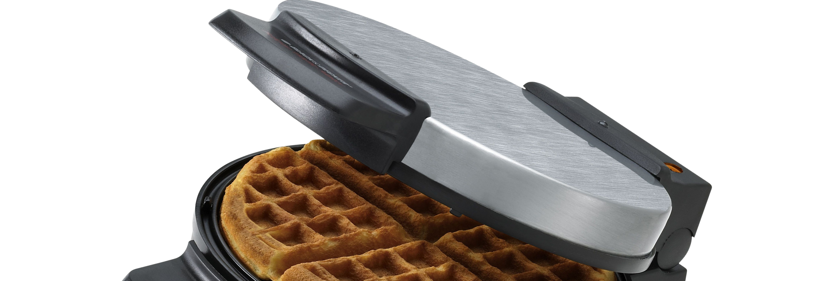 A thick, fluffy, 7-1/4-inch-diameter Belgian waffle is already divided into four sections and ready to be shared when it comes out of this handsome waffle maker. That's because the grids' dividers are high enough to separate the sections. The grids are nonstick, meaning they readily release the four-piece waffle and easily wipe clean. A ready light shines when the waffle maker is properly heated to accept the batter and shines again when the waffle is cooked. With its chrome housing and stay-cool black synthetic handles, this 650-watt appliance looks great on the counter. Afterward, the cord wraps around the hinge, plus you can stand the waffle maker upright for compact storage.